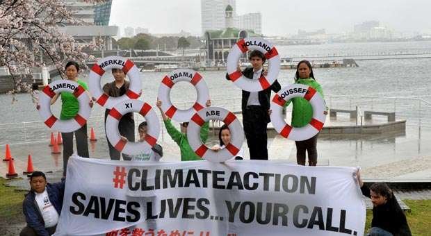 | Membros do Greenpeace fazem cobranças a líderes mundiais, no lado de fora de reunião do IPCC no Japão |